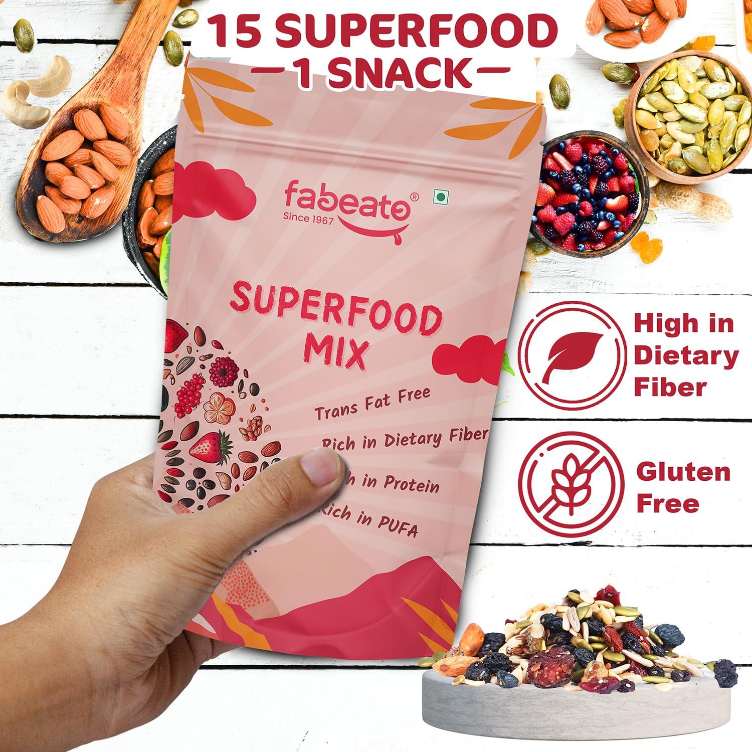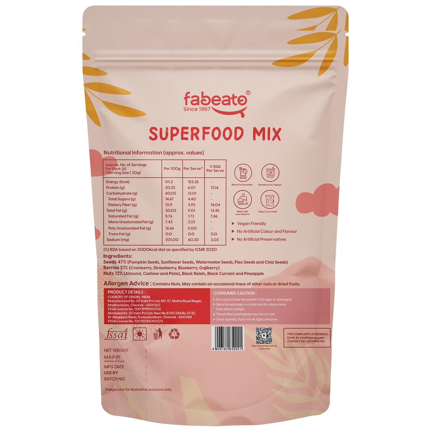 INGREDIENTS: Seeds 47% (Pumpkin Seeds, Sunflower Seeds, Watermelon Seeds, Flax Seeds and Chia Seeds), Berries 21% (Cranberry, Strawberry, Blueberry, Gojiberry), Nuts 12% (Almond, Cashew and Pista), Black Raisin, Black Currant and Pineapple .