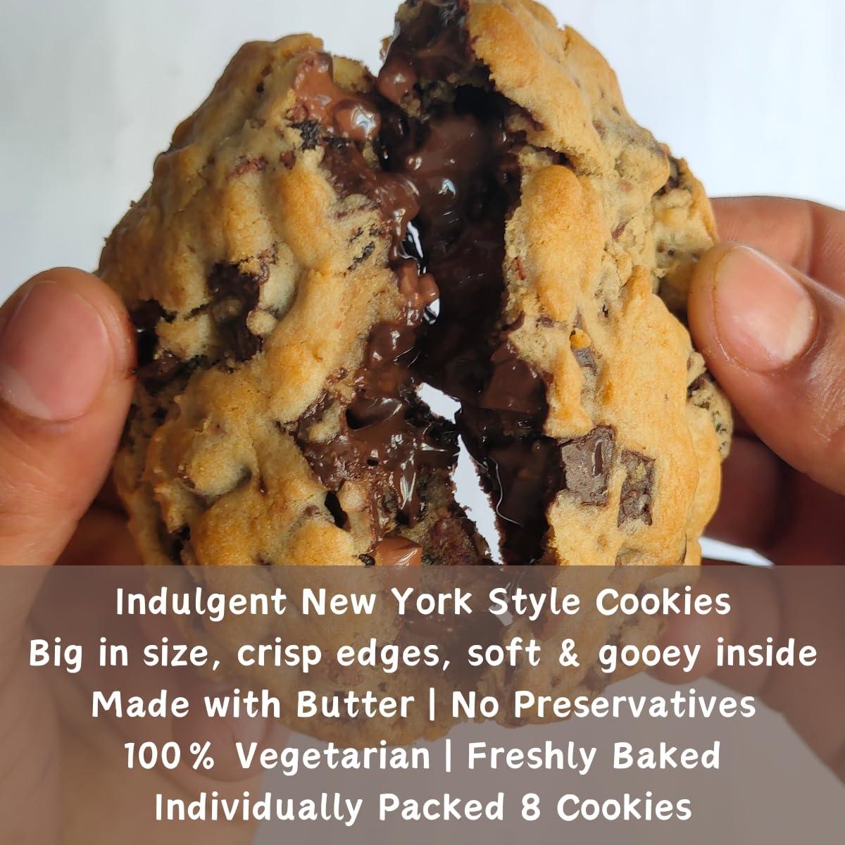 Indulgent New York Style inspired Choco Chip Cookies, big in size, crisp on the edges and soft & gooey on the inside. Made with rich intense dark chocolate chunks, super smooth milk chocolate chunks and Madagascan Vanilla Essence.