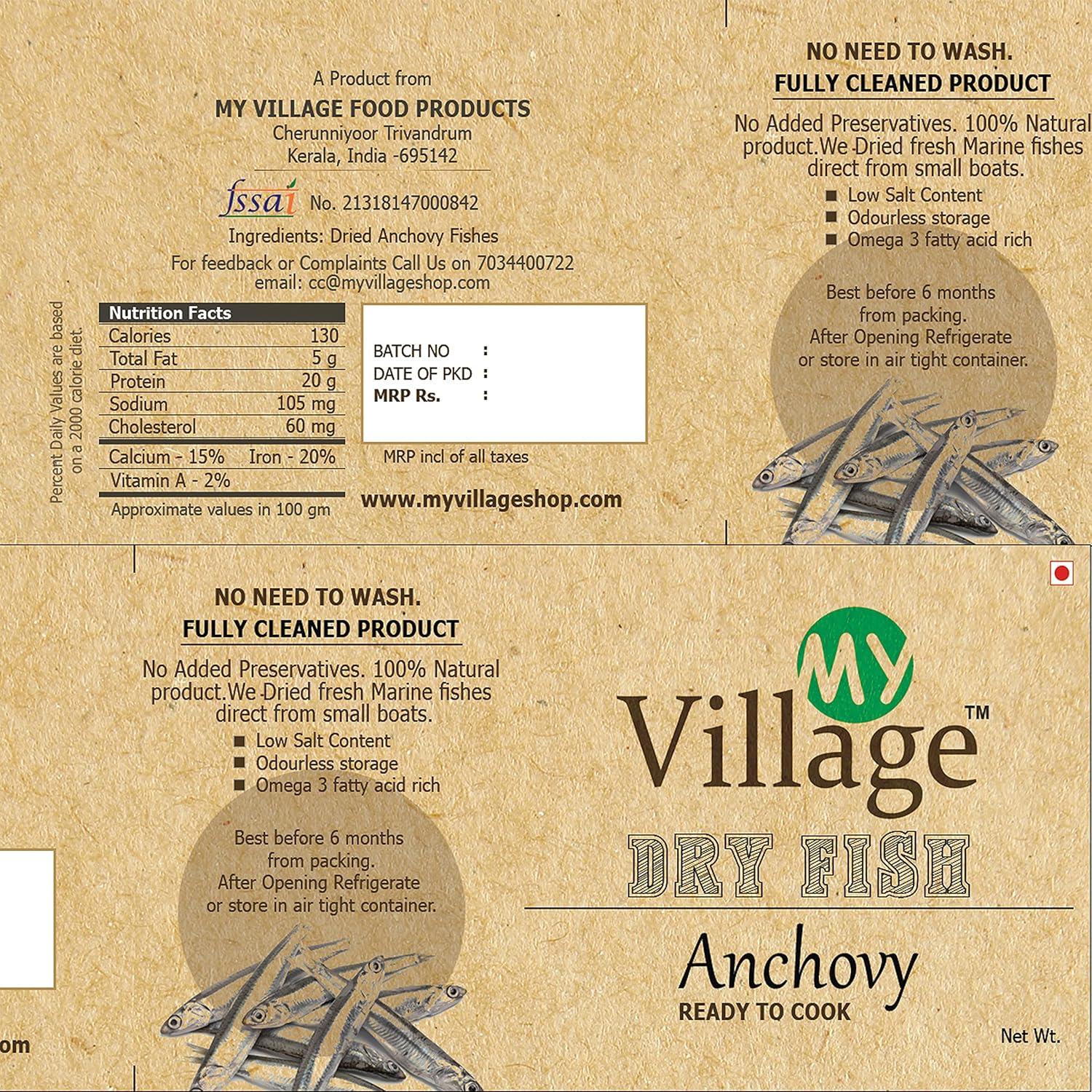 My Village Dry Anchovy fishes contain calcium, iron, magnesium, phosphorus, potassium, sodium, and zinc. Anchovies are a good source of vitamins such as thiamin, riboflavin, niacin, folate, vitamin C, B12, B6, A, E, and K.