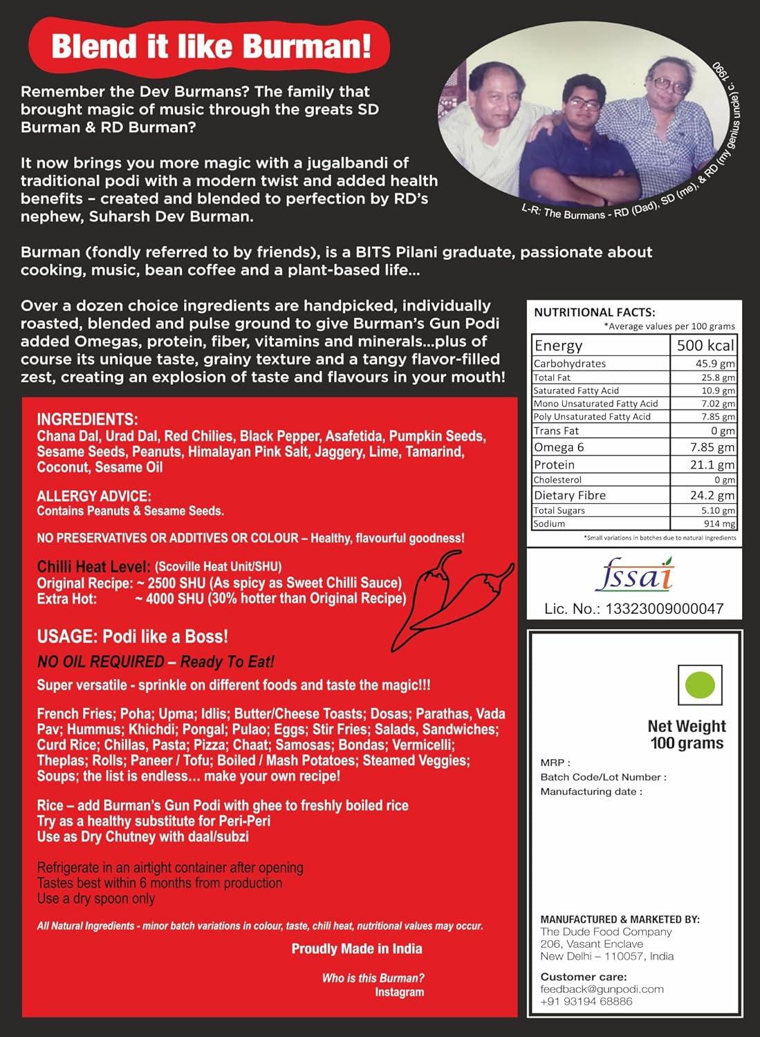 PLS READ: A gourmet, non-traditional, modern and a new creation altogether, using many more ingredients, inspired by and evolved from home recipes of South India. Not just any podi, this is Burman's Gun Podi...mind it! :-)