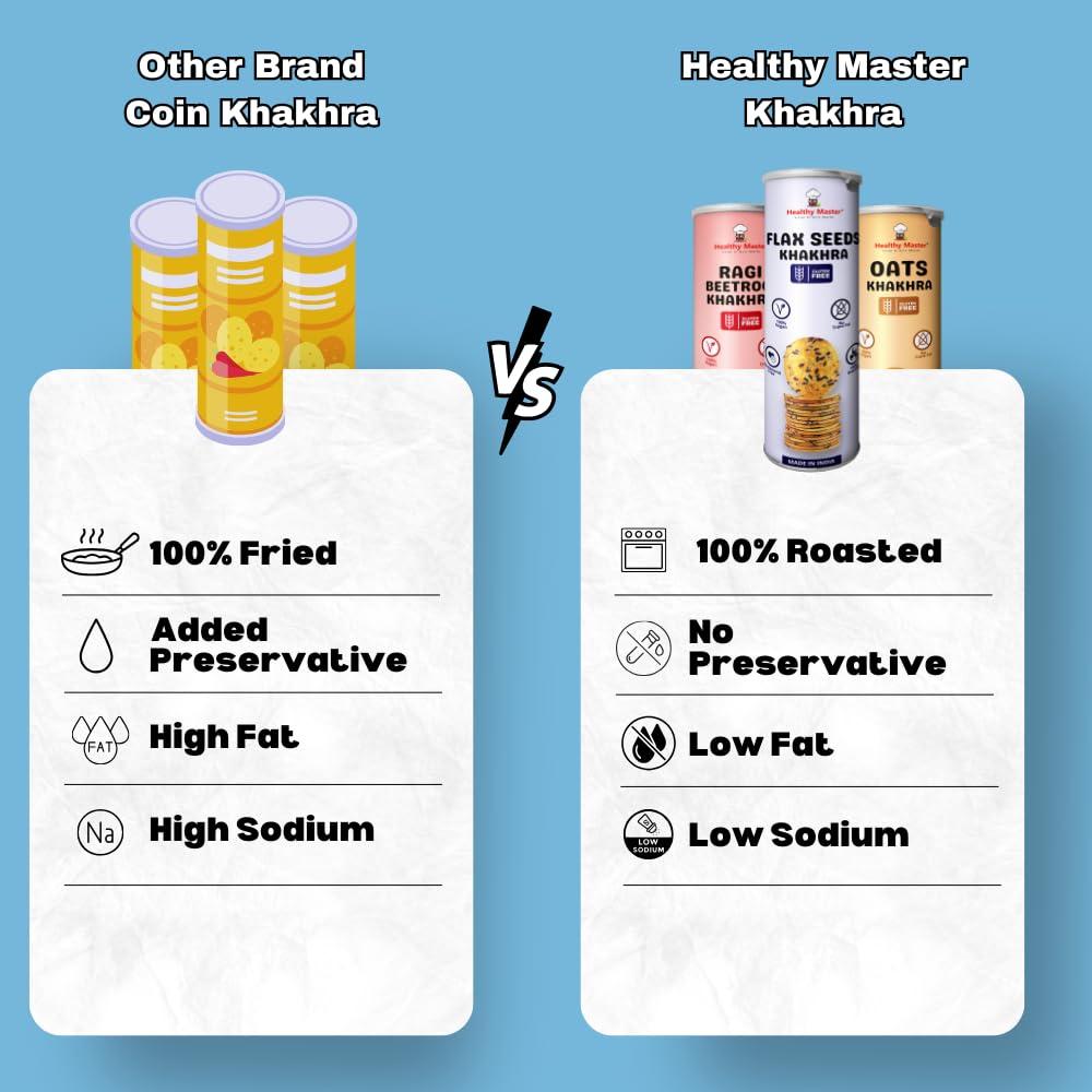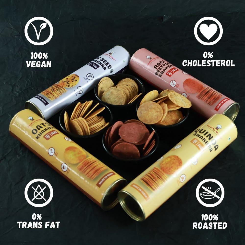 POWER-PACKED SNACKING, ONE CRUNCH AT A TIME: Discover the perfect balance of nutrition and flavor with Healthy Master’s Khakhra Combo—a curated pack of Quinoa Khakhra, Beetroot Khakhra, Flaxseed Khakhra, and Oats Khakhra. Each variety is roasted, not fried, offering you high-protein snacks that are both low in calories and big on taste.