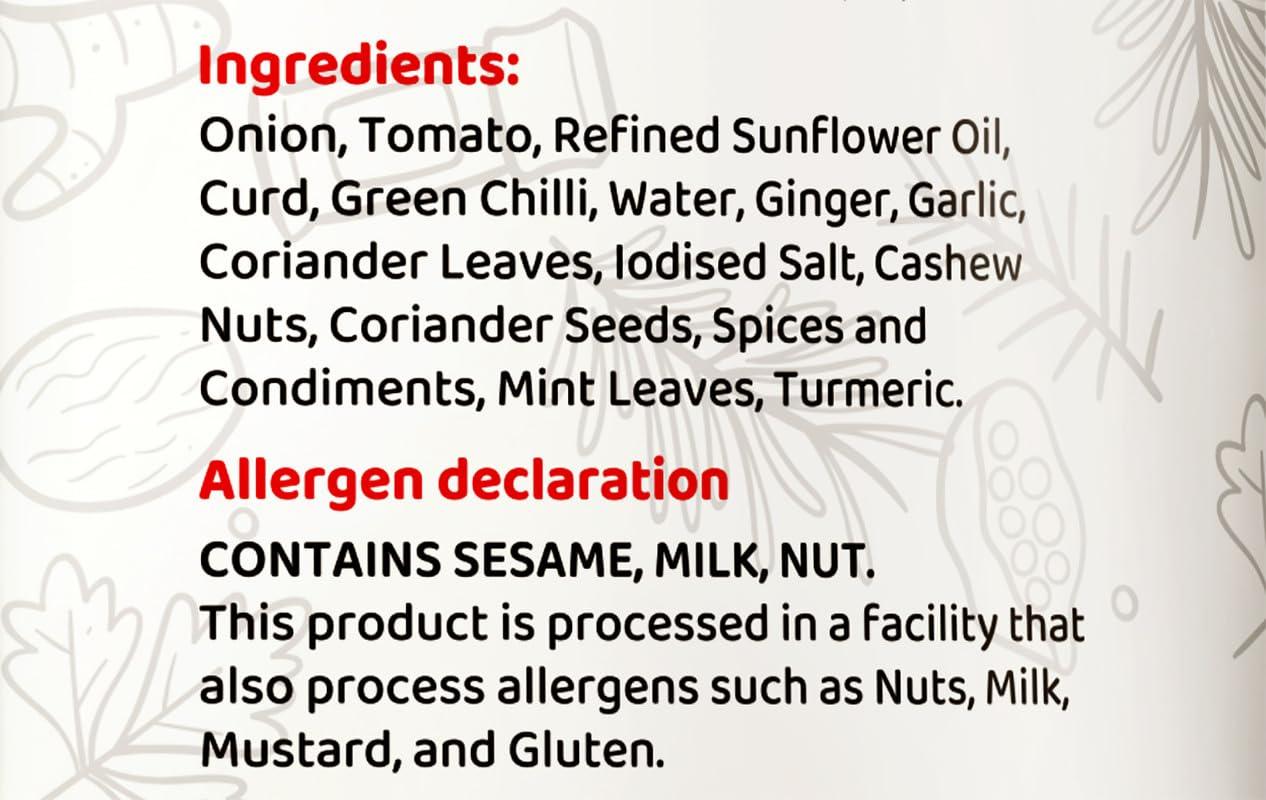 Ingredients:Onion, Tomato, Refined Sunflower Oil, Curd, Green Chilli, Water, Ginger, Garlic, Coriander Leaves, lodised Salt, Cashew Nuts, Coriander Seeds, Spices and Condiments, Mint Leaves, Turmeric.