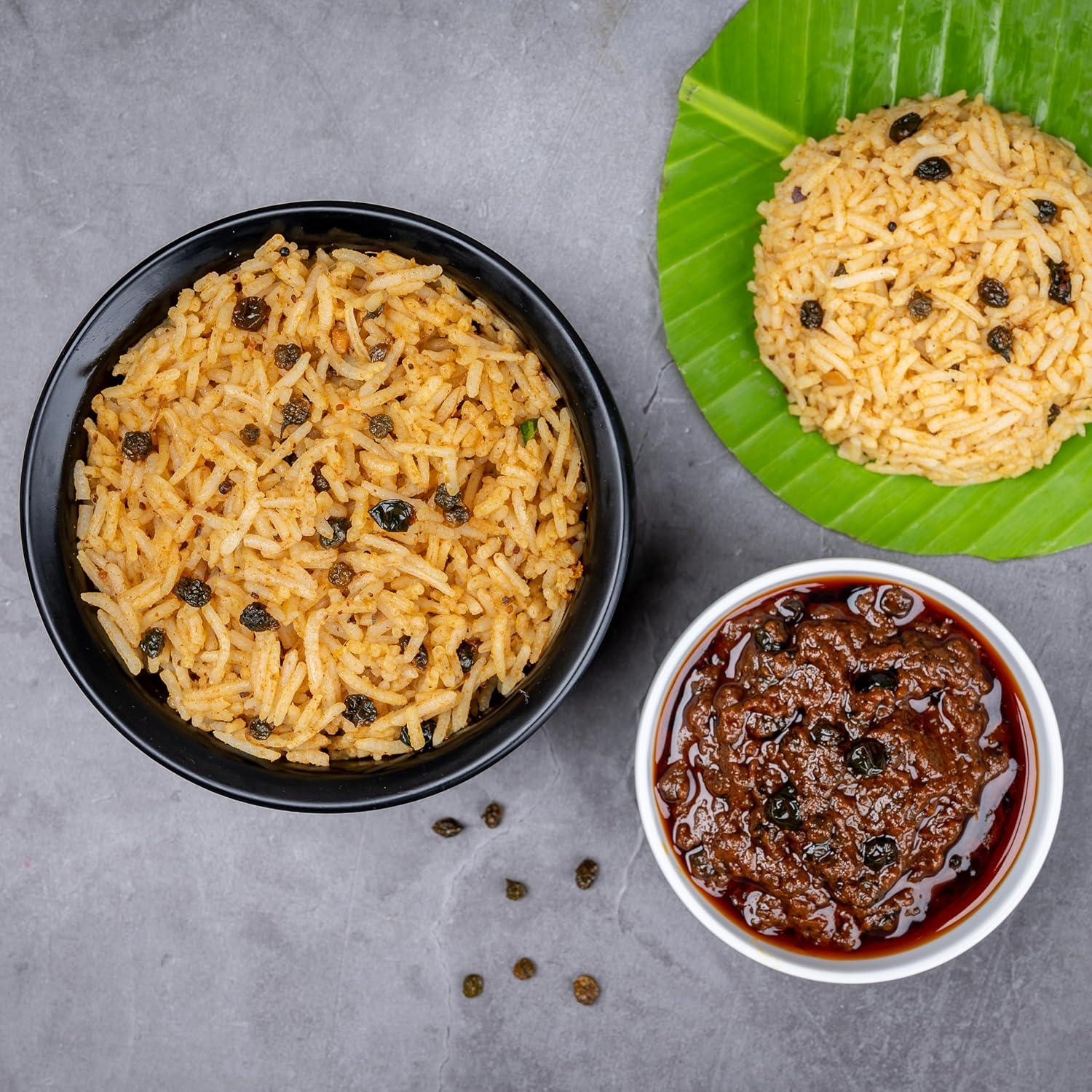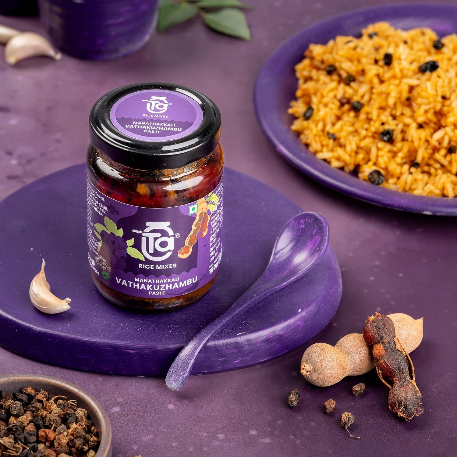 USAGE INSTRUCTIONS: Add a scoop of Vathakuzhambu paste to hot rice. Mix well. Allow 5 minutes for the flavours to soak in. Now the vathakuzhambu rice is ready to serve.