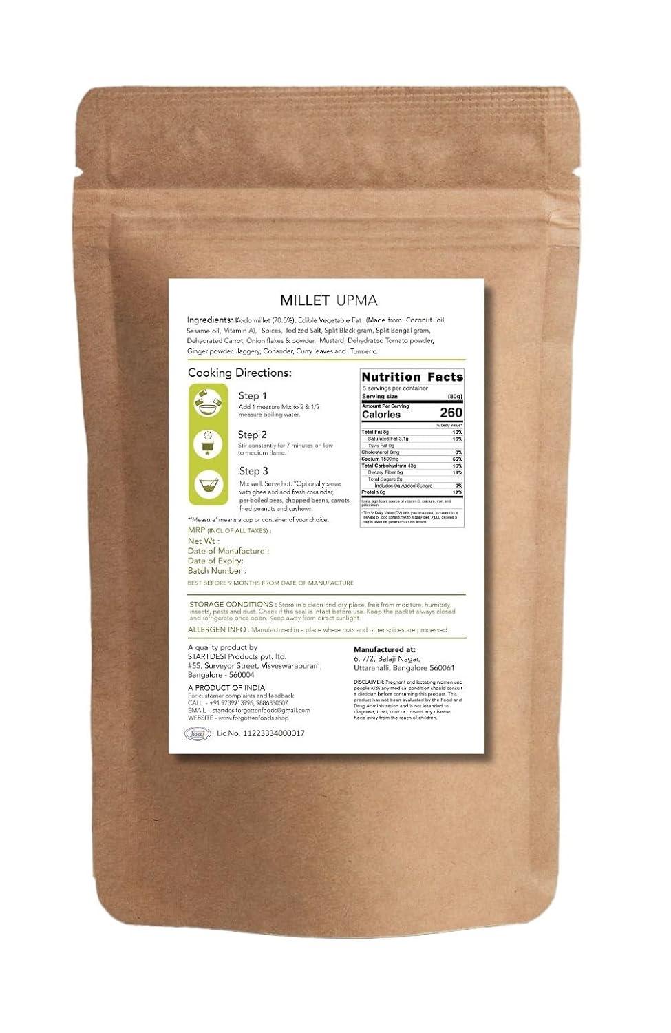 PACKAGE CONTENTS: 400 Gm Of Millet Upma; Serves 5 people; Shelf Life: 270 Days. Use how much ever required and store the pack in a refrigerator once opened.