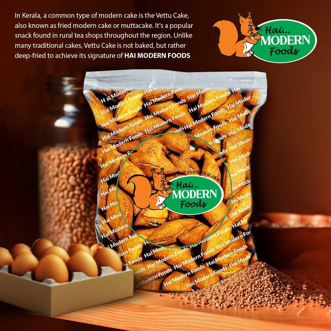 Experience the rich culinary tradition of Kerala with HAI MODERN FOODS Modern Cake, popularly known as Vettu Cake or Muttacake. This beloved South Indian snack is a household favorite, cherished for its deep-fried, crispy exterior and soft, flavorful interior. Whether you're enjoying a cup of chai at home or looking to serve an authentic South Indian treat to guests, our modern cake is the perfect companion. The HAI MODERN FOODS Modern Cake stands apart from conventional cakes because of its unique preparation method and traditional recipe. Unlike oven-baked cakes, Vettu Cake is deep-fried, giving it a satisfying crunch that’s followed by the warm, spiced notes of cardamom and the rich sweetness of jaggery and sugar. The recipe, handed down through generations, remains true to its roots, using quality ingredients like wheat flour, gram flour, eggs, and aromatic spices to ensure a truly authentic taste experience. This snack has a strong cultural connection with tea shops across Kerala, especially in rural areas where it has been a tea-time staple for decades. Now, with HAI MODERN FOODS, you can enjoy the same traditional flavor packed with care and hygiene in every bite. Our modern cake is not just a snack; it’s a nostalgic reminder of simpler times, crafted for the modern world. Each bite delivers the unmistakable taste of home-cooked goodness, freshly fried and sealed to lock in flavor and freshness. Our preparation process follows strict quality standards to maintain taste, safety, and consistency. The dough is expertly kneaded and shaped into its signature pillow-like form, then fried until golden brown. Once cooled, the snacks are carefully packed to preserve their crispiness and ensure you enjoy them just as if they were freshly made. HAI MODERN FOODS is committed to delivering genuine, wholesome products rooted in tradition. Our modern cake contains no artificial colors, preservatives, or additives—just pure ingredients and time-honored methods. Whether you're craving something sweet after a meal, a crunchy snack with coffee, or an ideal gift for someone who loves South Indian treats, this is a must-have in your pantry. Perfect for children and adults alike, our modern cake pairs well with chai, filter coffee, or even on its own as a flavorful snack between meals. It's also a great choice for festivals, gatherings, or just nostalgic evenings with family. With each pack, you're getting not just a snack, but a cultural experience that celebrates the essence of Kerala's food heritage. Bring the flavors of Kerala into your kitchen with this traditional snack that combines the richness of local ingredients with the love of homemade taste. HAI MODERN FOODS ensures every pack is freshly prepared, hygienically packed, and ready to be enjoyed anytime, anywhere.