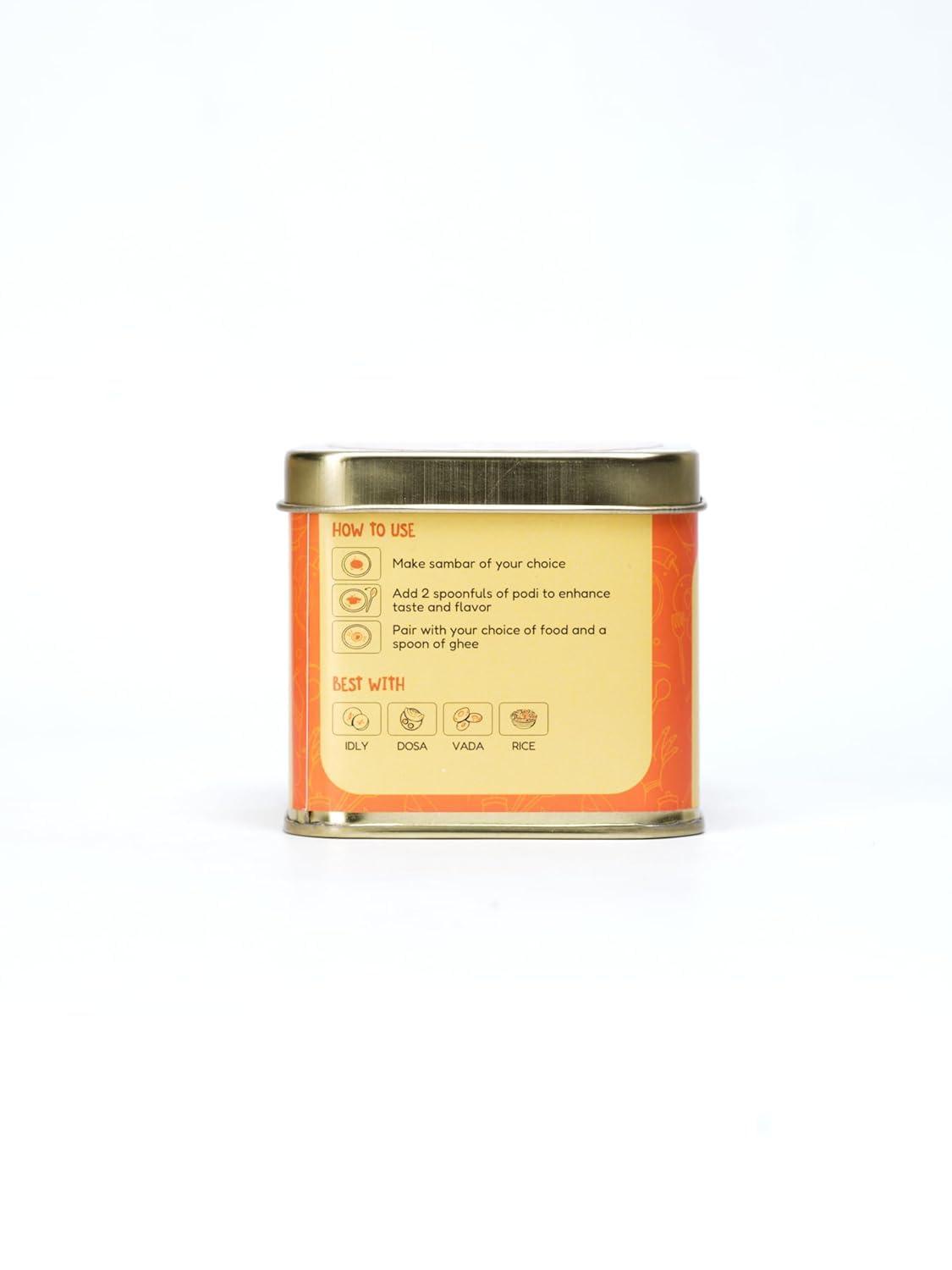 How To Use: Make sambar of your choice. Add 2 spoonfuls of podi to enhance taste and flavour. Pair with your choice of food and a spoon of ghee.