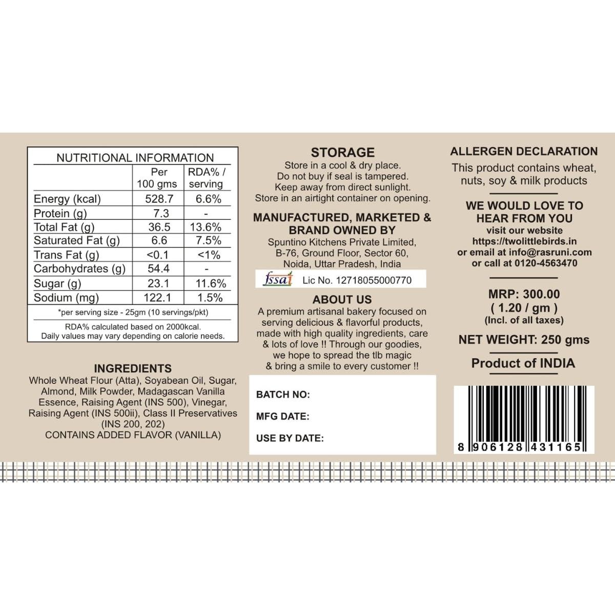 100% Whole Wheat tender and soft Dry Cake made with Californian Almonds and Madagascan Vanilla Essence. Contains No Maida