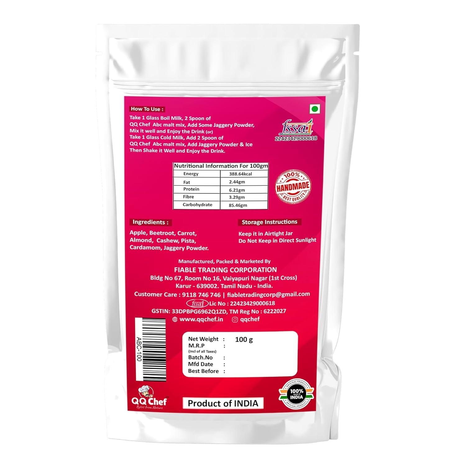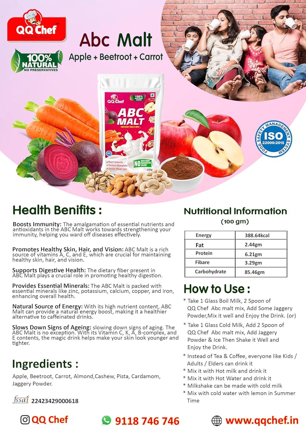 QQChef ABC Malt Milk Mix is a delightful natural drink that provides nourishment for kids, adults, and elders alike. This powdered mix can be easily prepared by mixing it with milk or water, creating a delicious and wholesome beverage. With a pack size of 100gm, it offers a convenient and portable option for enjoying a nutritious drink on-the-go or at home. Indulge in the rich, malty flavour while benefiting from the essential nutrients it provides. Savour the goodness of QQChef ABC Malt Milk Mix and make it a part of your daily routine for a healthier lifestyle.