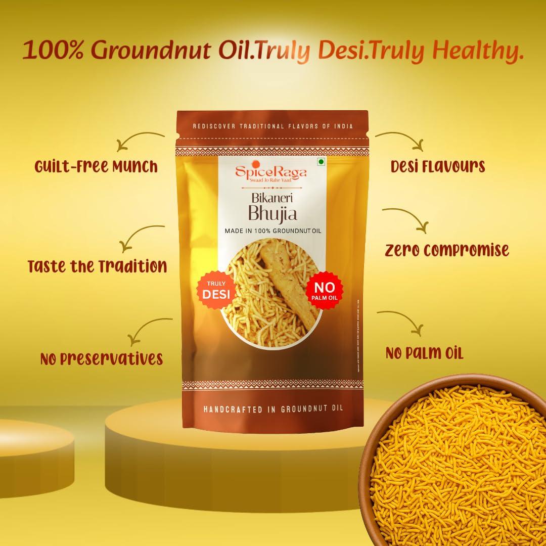 Authentic Bikaneri Bhujia: Enjoy the classic taste of Indian traditional snacks, crafted with pure moth aata, besan, and groundnut oil for an unparalleled crispy and spicy experience.
