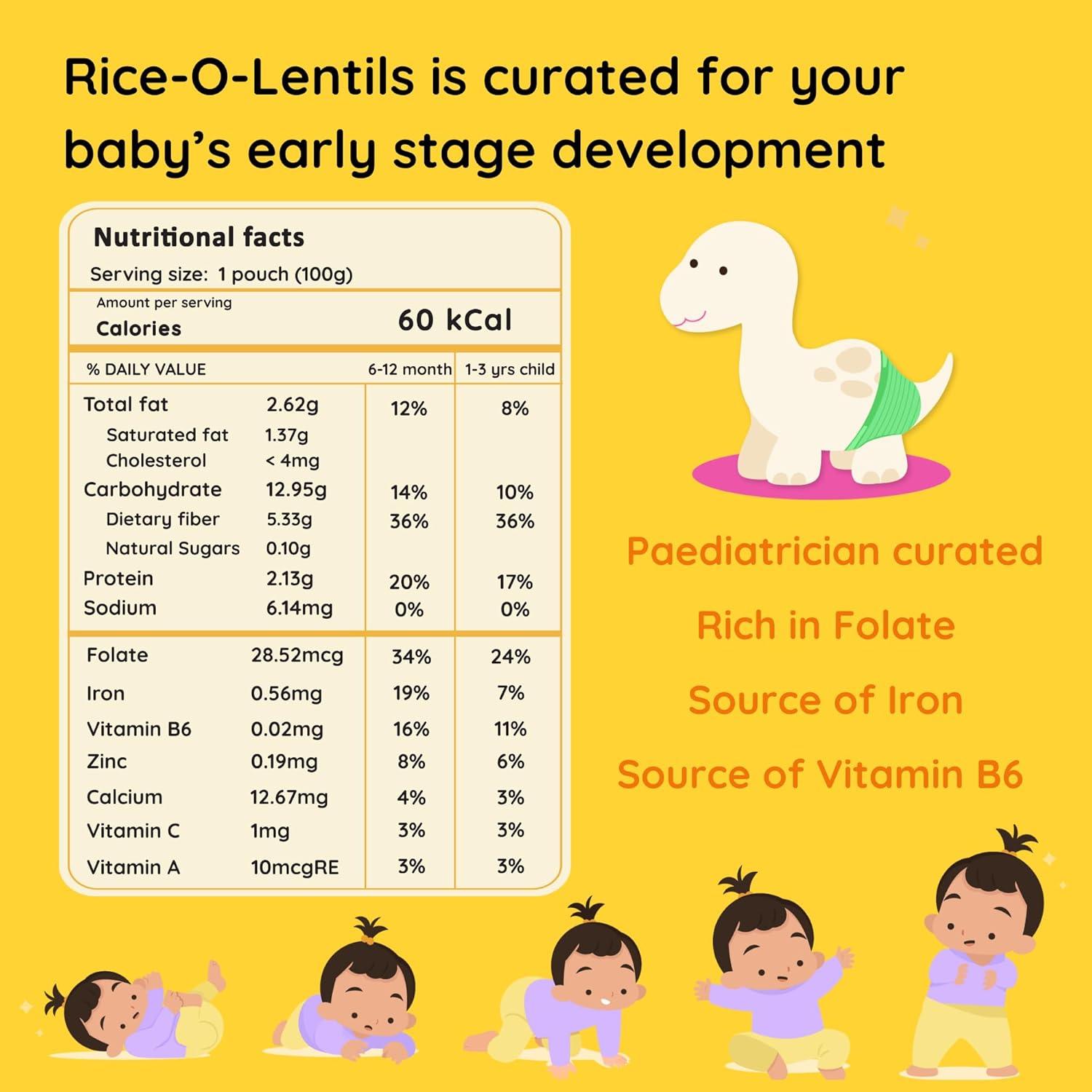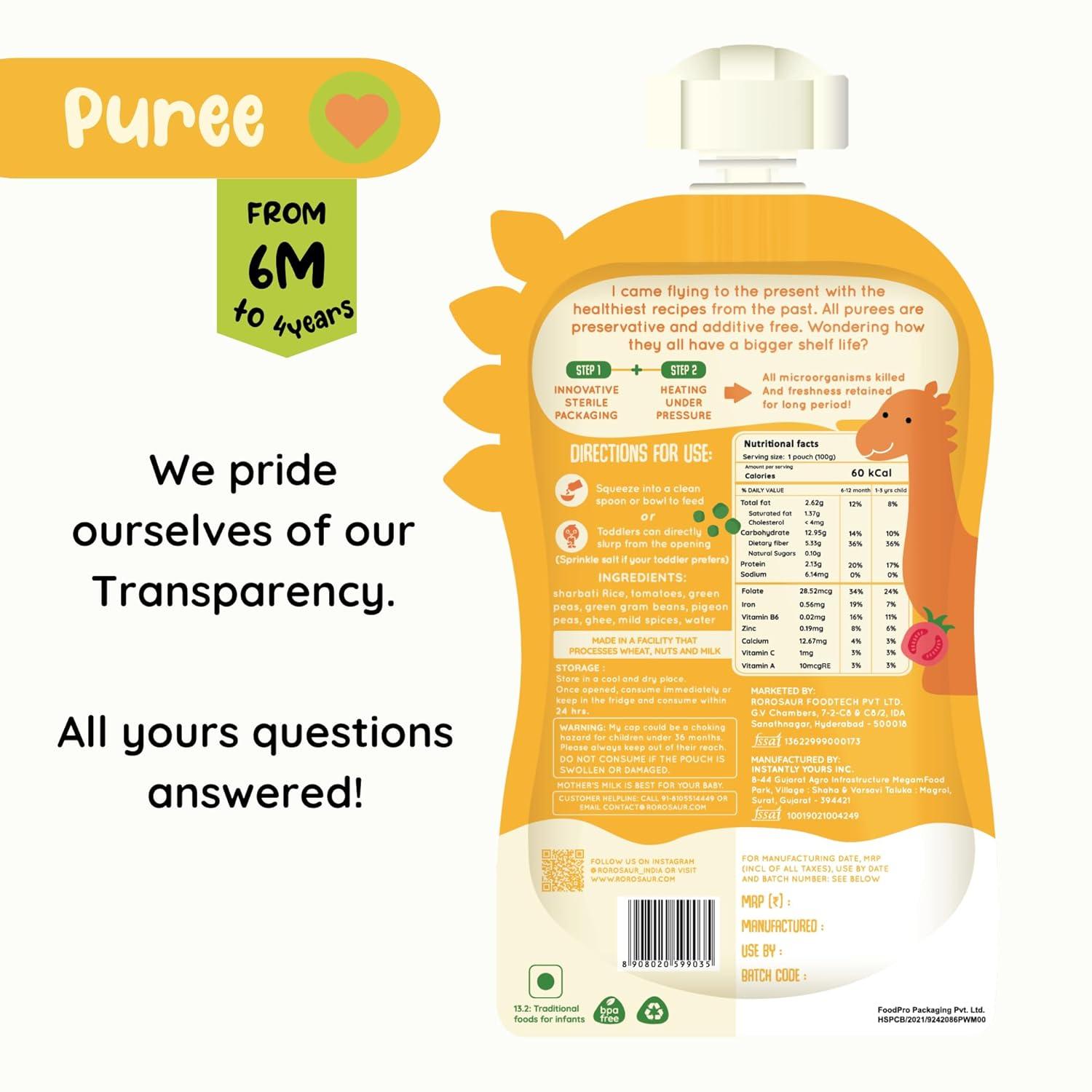 Ingredients: Familiar Home Made Dal Kichdi further improved by using Peas to boost protein and using 2 types of lentils which bring different essential amino acids and nutrients to the meal. No salt added to be safe for young ones. 🦖